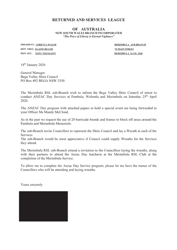 An Ordinary Meeting of the Bega Valley Shire Council will be held at Council Chambers, Biamanga Room Bega Valley Commemorative Civic Centre Bega on Wednesday, 25 February 2026 commencing at 2:00pm to consider and resolve on the matters set out in the attached Agenda.