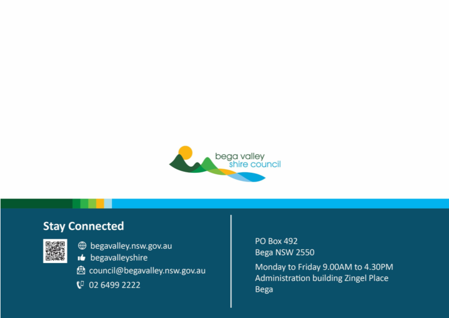 The recording will be archived and made available on Council’s website www.begavalley.nsw.gov.au. All care is taken to maintain your privacy; however as a visitor of the public gallery, your presence may be recorded.