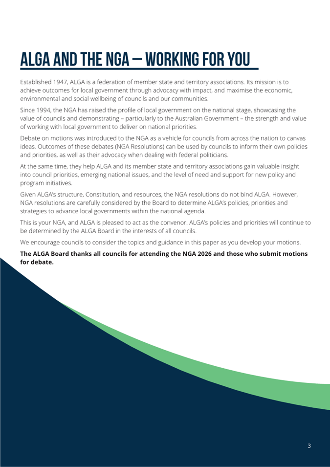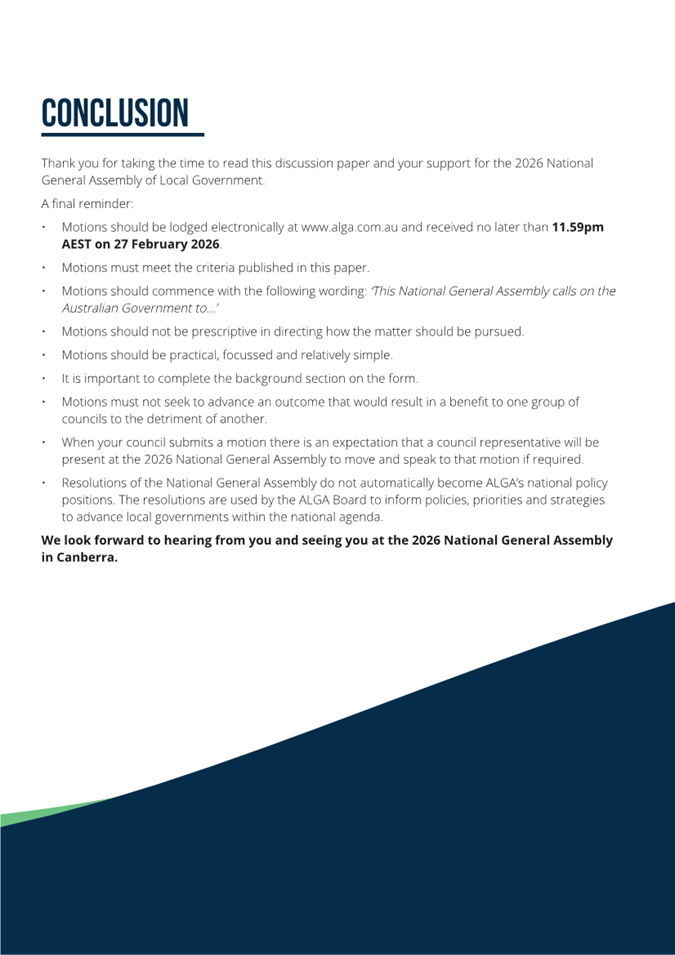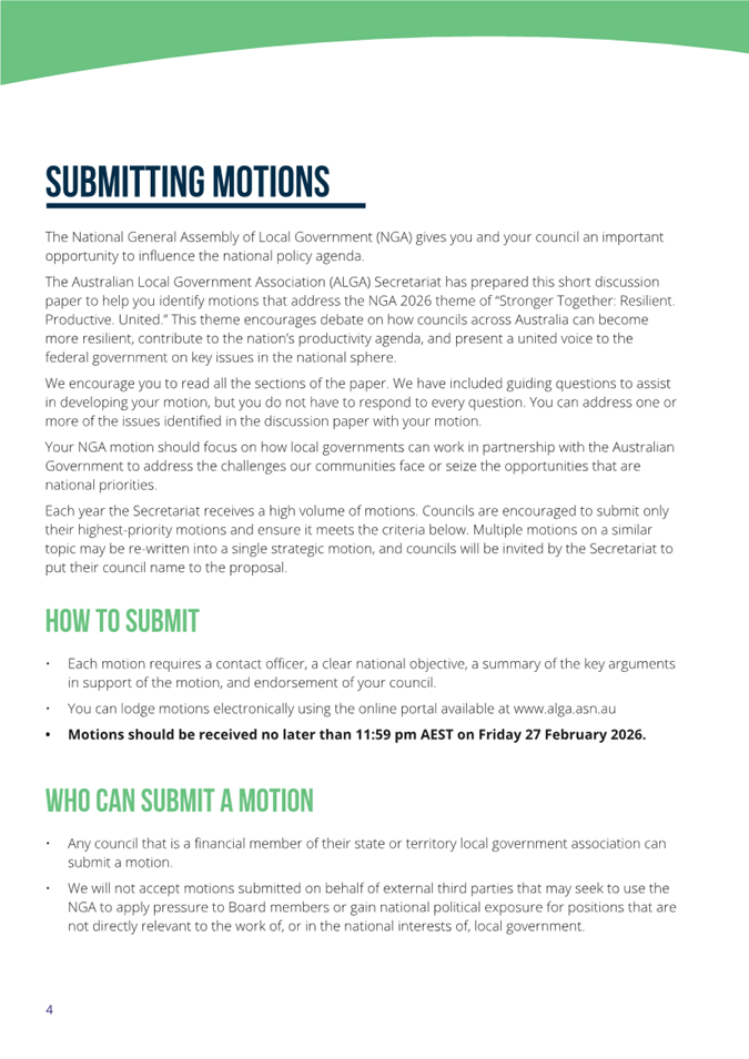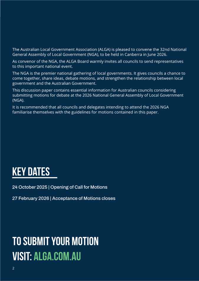 Councils are encouraged to read the Discussion Paper (Attachment 1) that contains essential information for councils considering submitting motions for debate at the Assembly. ALGA has called for motions to be considered at the NGA to be forwarded by 27 February 2026.
