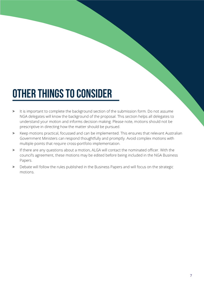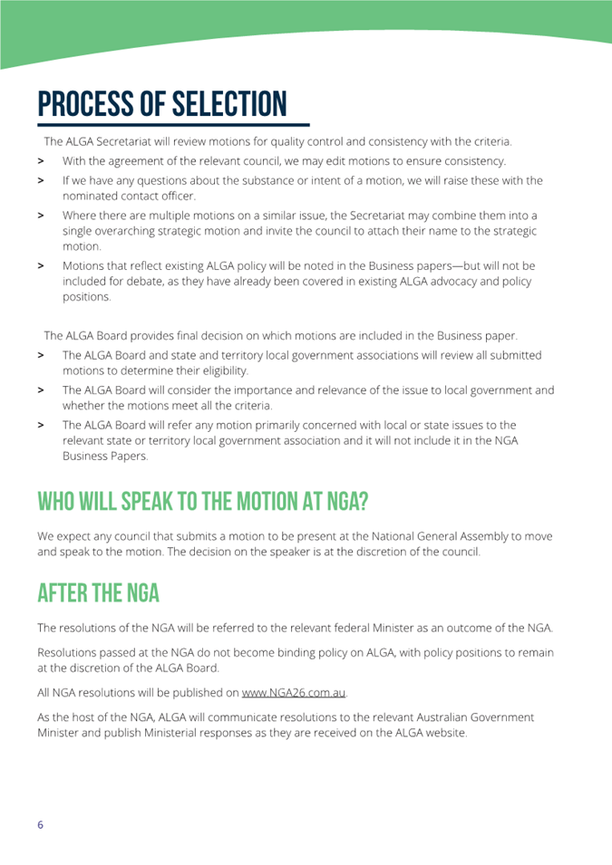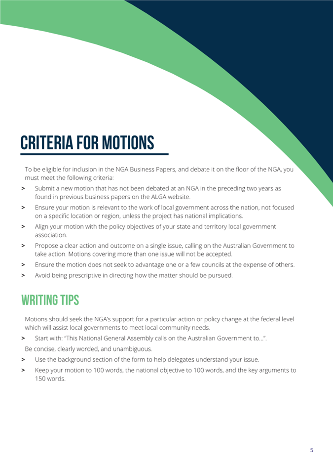 To be eligible for inclusion in the NGA Business Papers, and then debated on the floor of the NGA, motions must meet the following criteria: