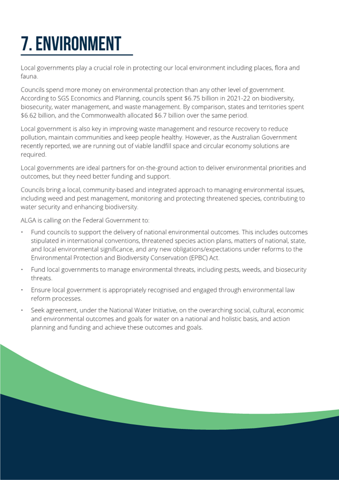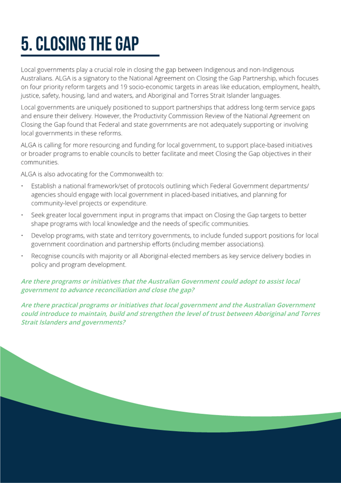 This National General Assembly calls on the Australian Government to provide national leadership to support Closing the Gap outcomes through a review of Commonwealth biodiversity and environmental legislative and policy settings to ensure they do not unintentionally constrain Aboriginal Land Councils and other Aboriginal landholders from activating their land for housing, economic development and community benefit. |