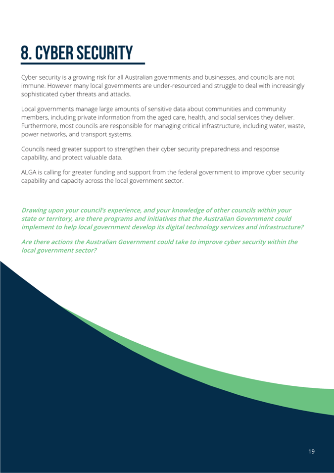 The Audit Office of NSW and ALGA have both identified cyber security as a growing risk for local government, with councils under-resourced to meet the challenge. Federal Government leadership, funding, and partnership are needed to ensure local governments can protect their communities and infrastructure in an increasingly digital environment. Essential 8, Cyber Act and Critical Infrastructure legislation are relevant for local government to adopt and observe. Likewise, the Data and Digital Government Strategy sets out a comprehensive approach to cyber security, data management, and digital capability for the Australian Public Service. Local governments face similar risks and responsibilities but lack equivalent resources and support. Extending the Strategy’s relevant elements to local government will strengthen national cyber resilience, protect communities, and ensure consistent standards across all levels of government. |