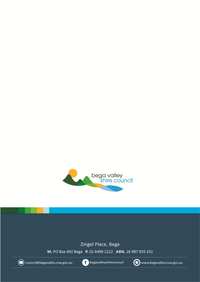 The recording will be archived and made available on Council’s website www.begavalley.nsw.gov.au. All care is taken to maintain your privacy; however as a visitor of the public gallery, your presence may be recorded.